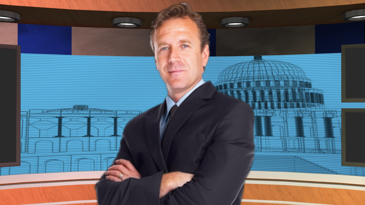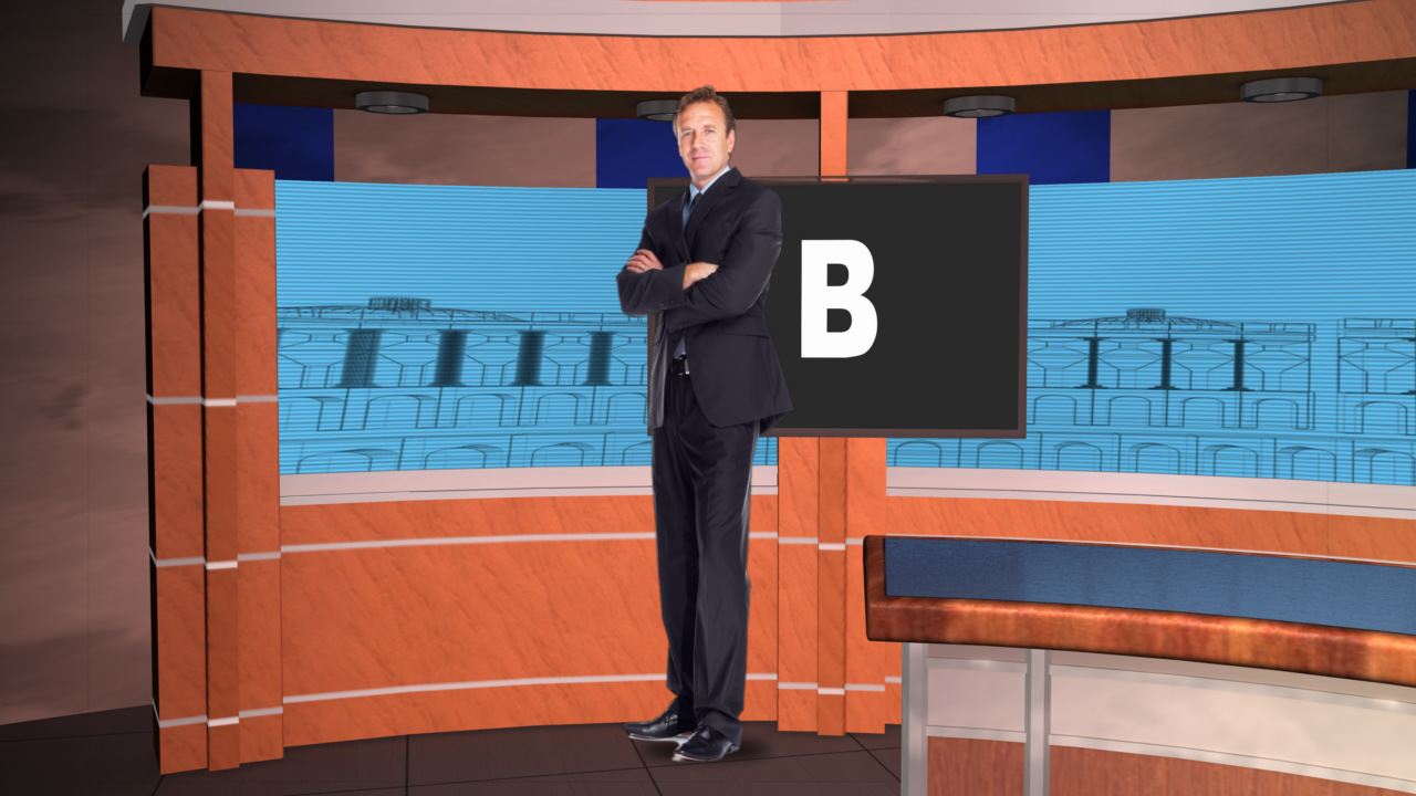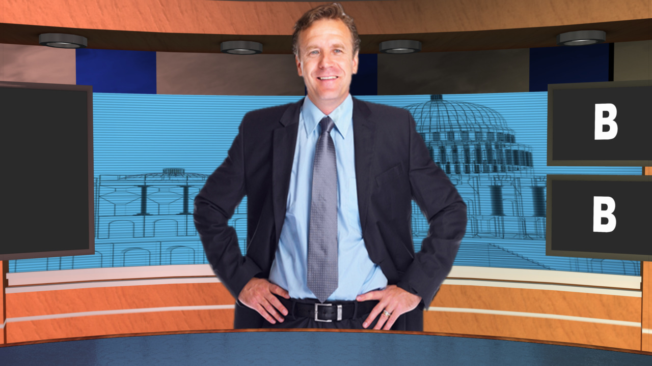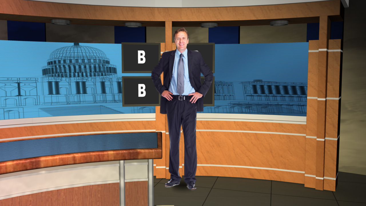 Virtual Set Studio 103 for Virtual Set Editor is a newsdesk with a wireframe of the capital in the background.