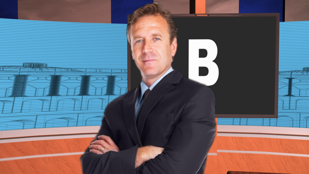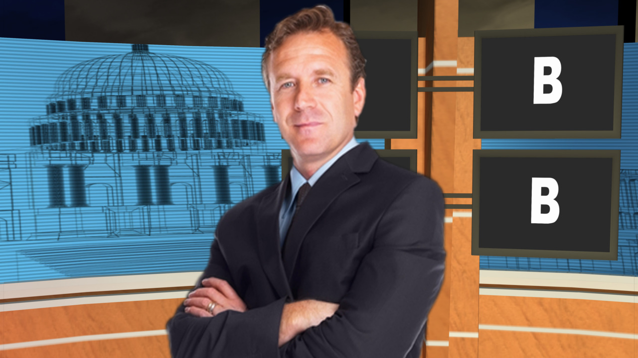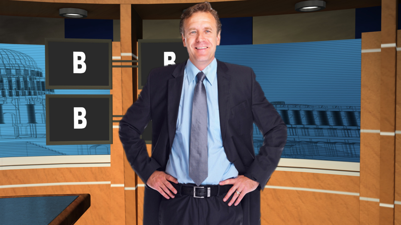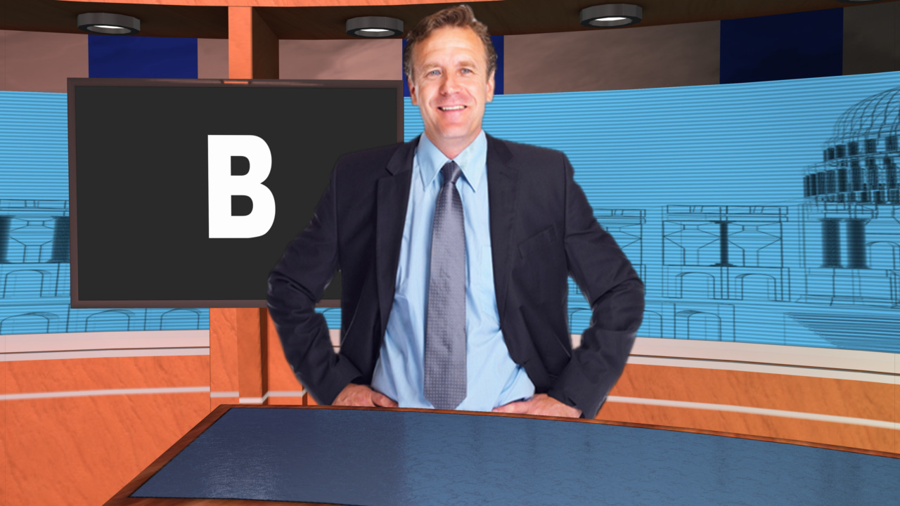 Virtual Set Studio 103 for Virtual Set Editor is a newsdesk with a wireframe of the capital in the background.