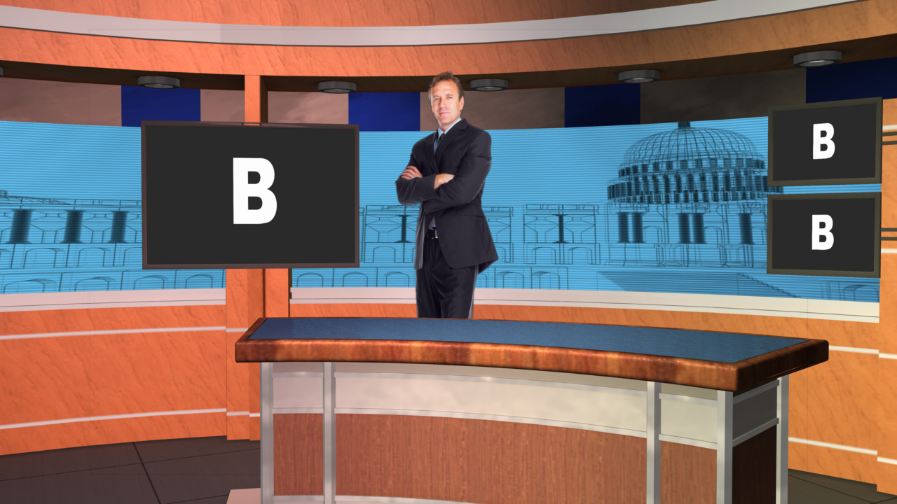 Virtual Set Studio 103 is a news desk with 8 LCD monitors and a blue glass panel with a wireframe
