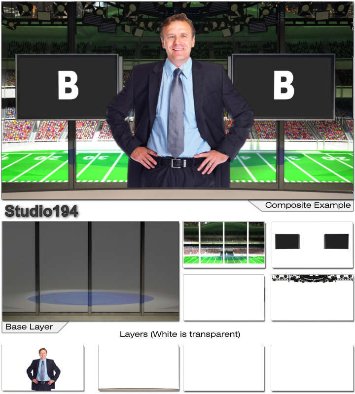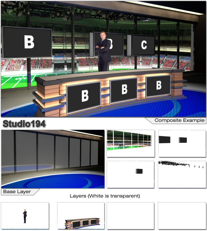 Virtual Set Studio 194 is a sports news desk with optional desk and replacable background to change sports.
