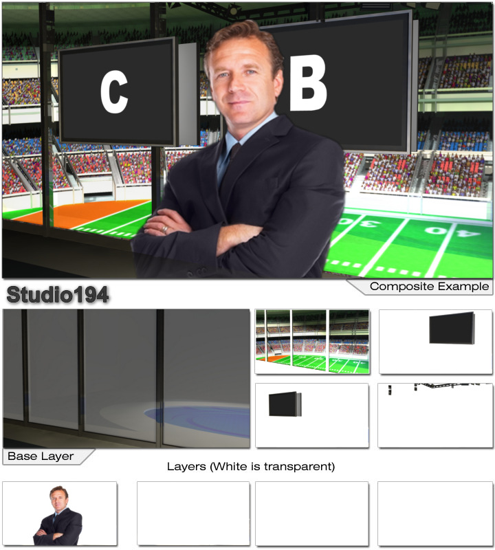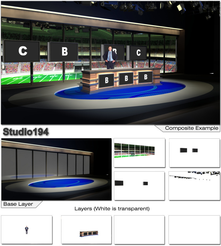 Virtual Set Studio 194 for Virtual Set Editor is a sports news desk with optional desk and replacable background to change sports.
