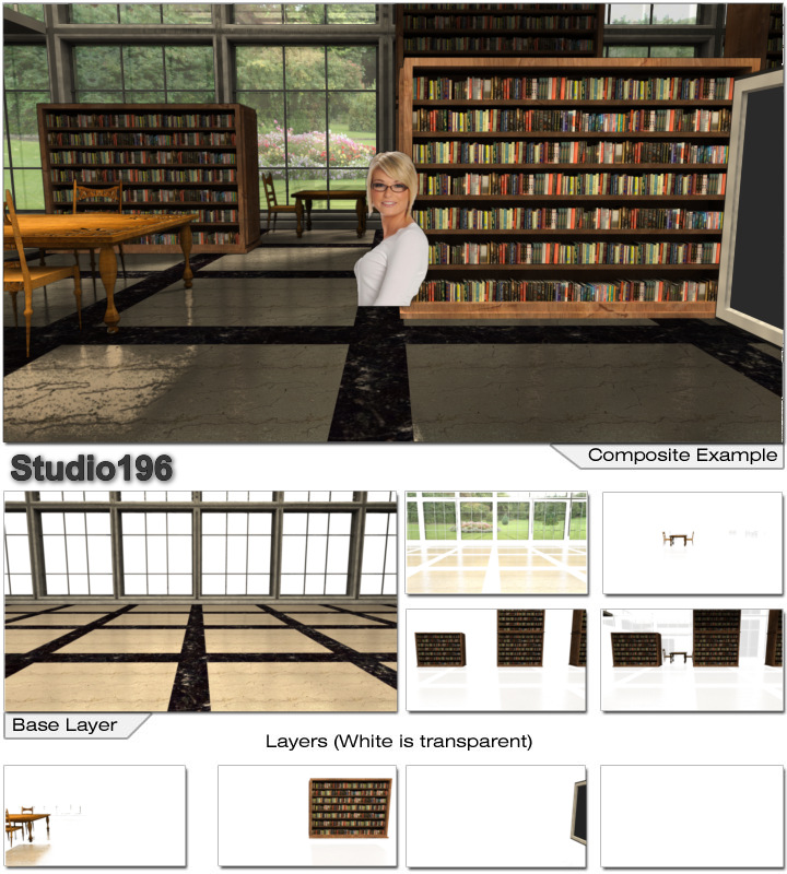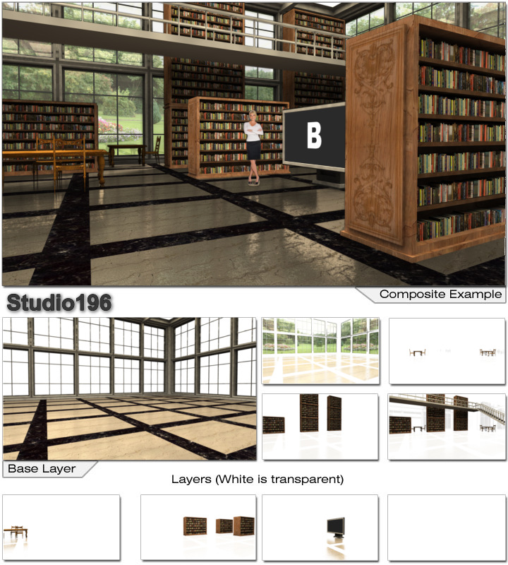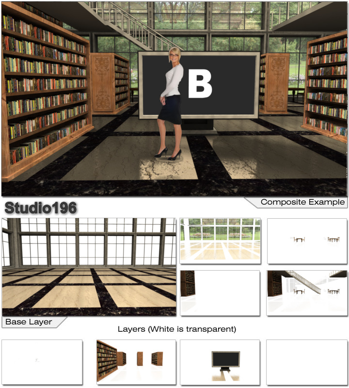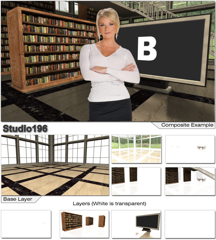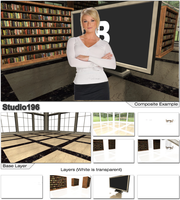 Virtual Set Studio 196 is an airy library with optional monitors and furniture.