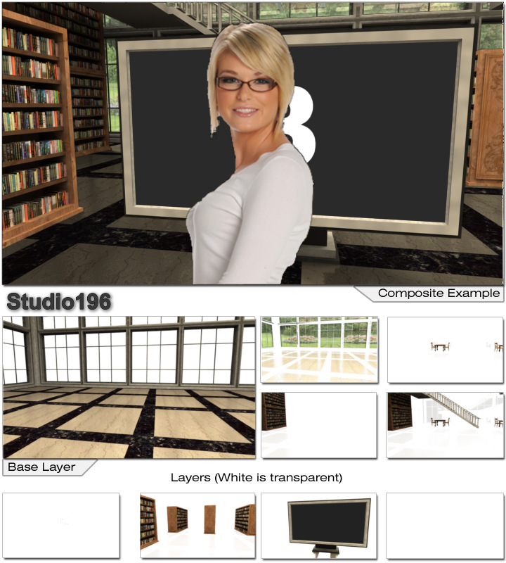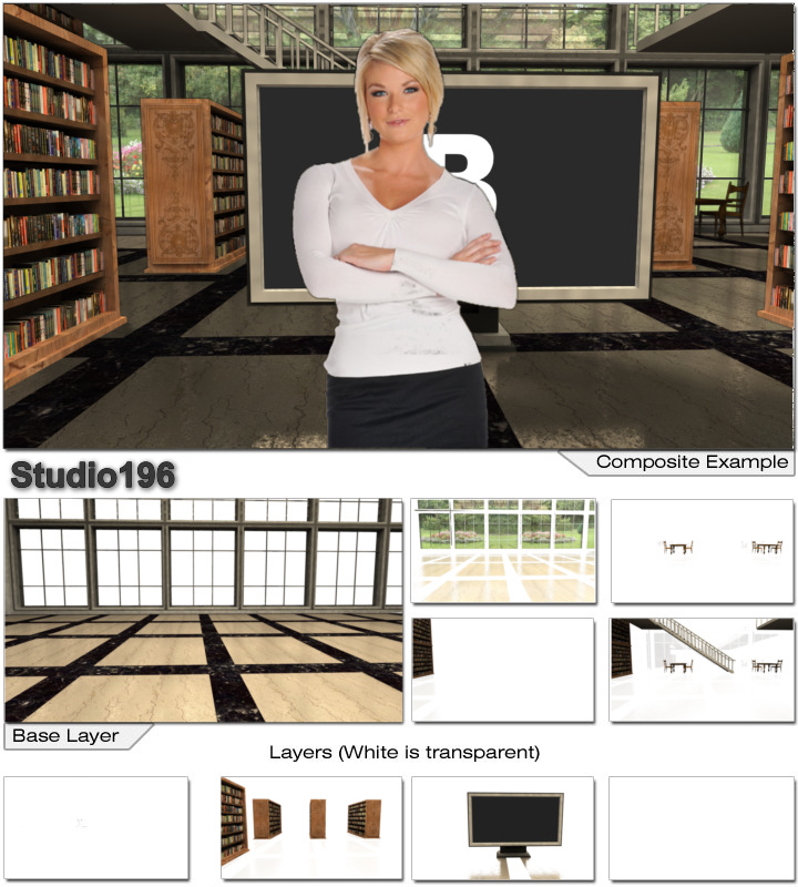 Virtual Set Studio 196 for HD is an airy library with optional monitors and furniture.