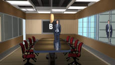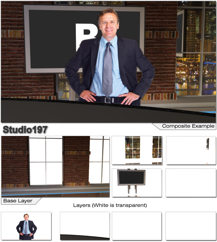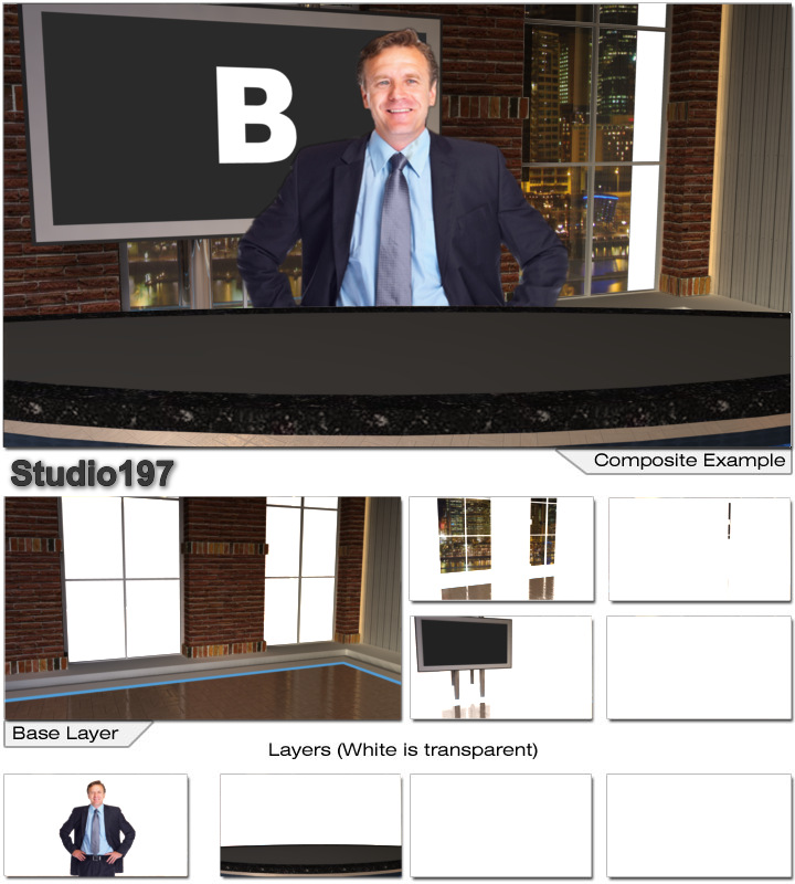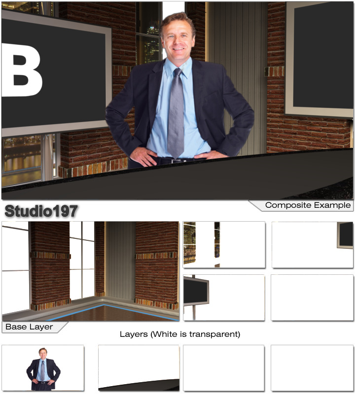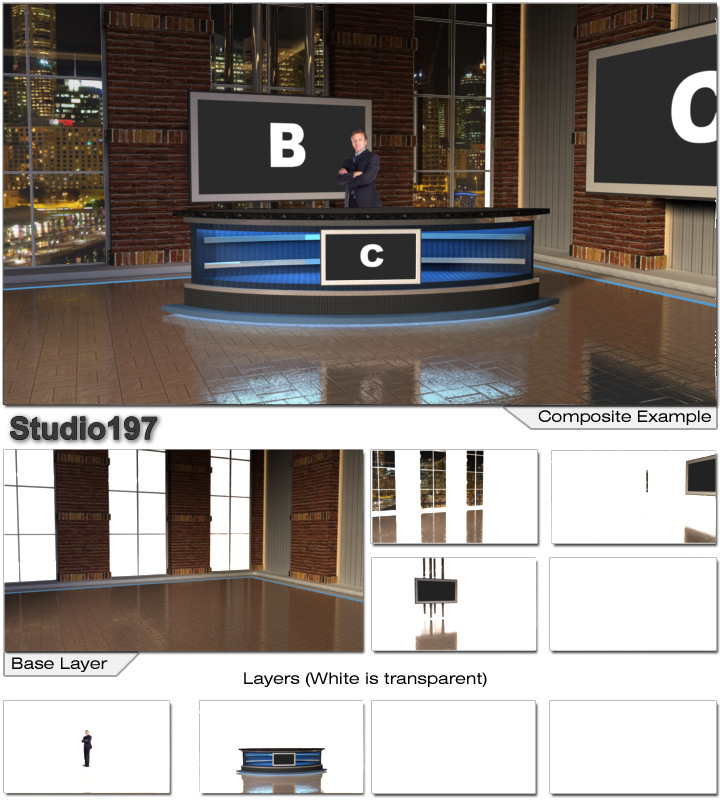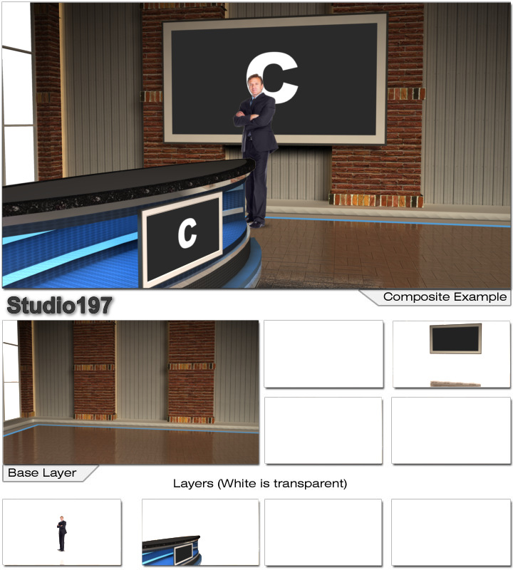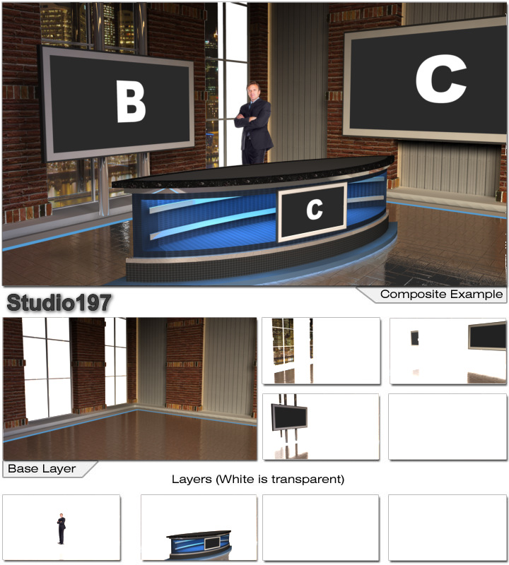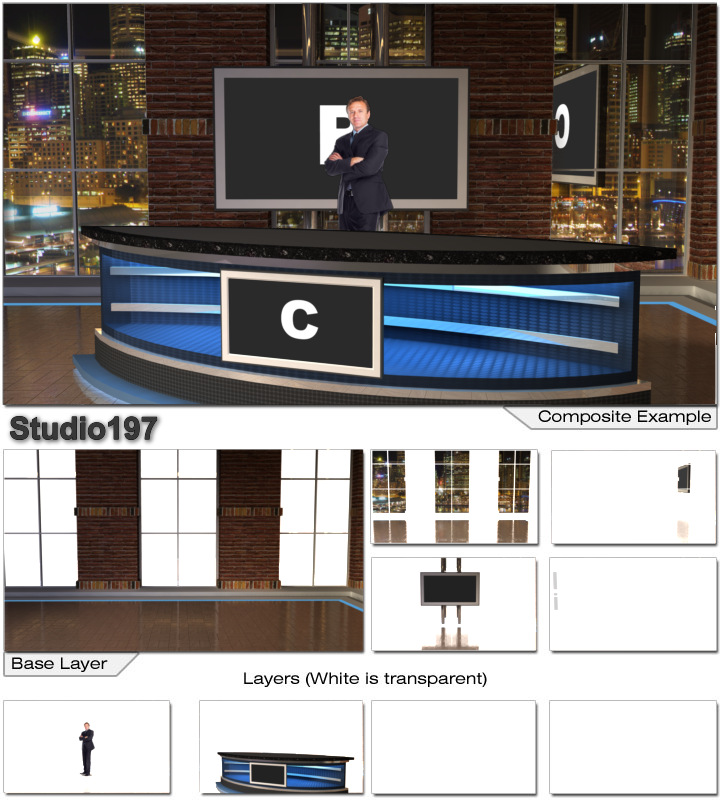 Virtual Set Studio 197 is a news desk with replacable skyline and optional monitors and desk.