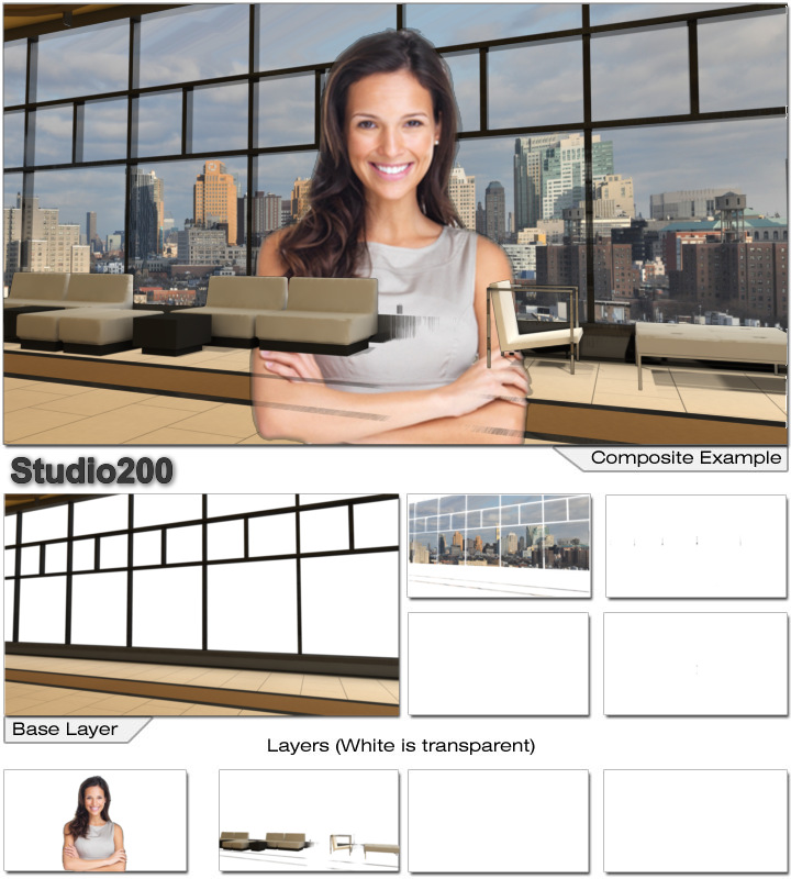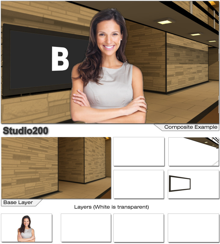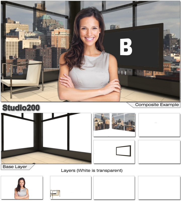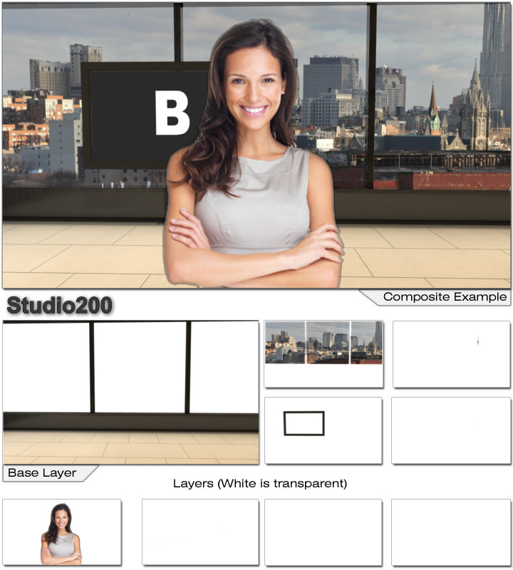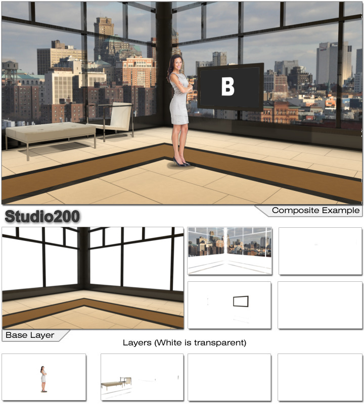 Virtual Set Studio 200 is a virtual news studio with a control room, optional desk, and configurable monitors.