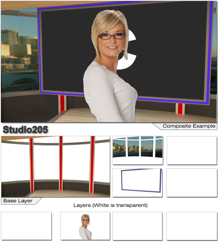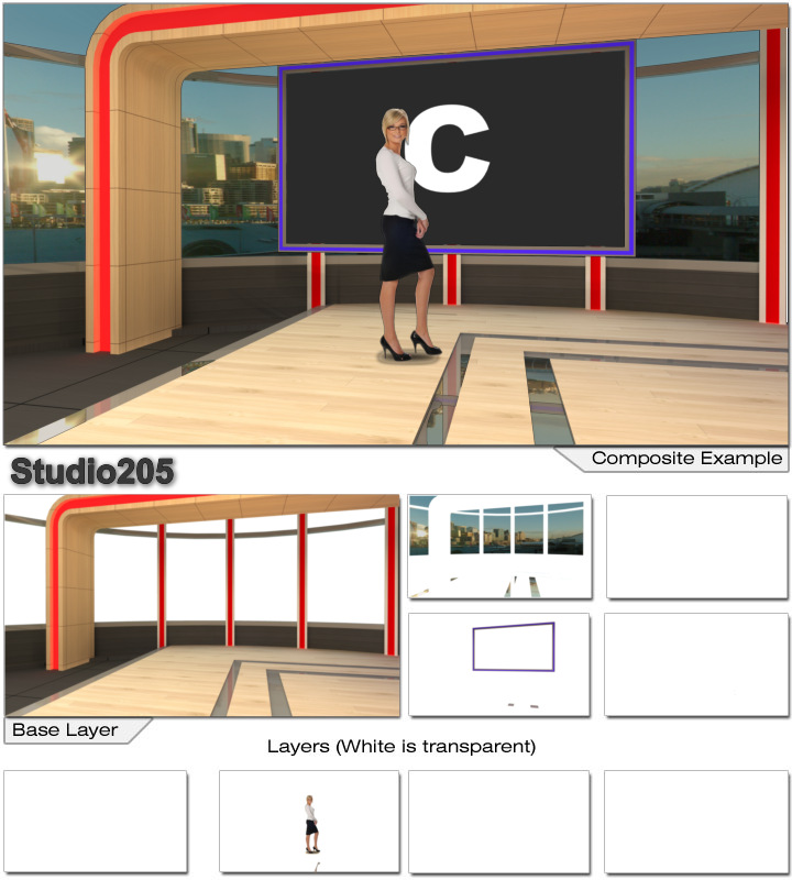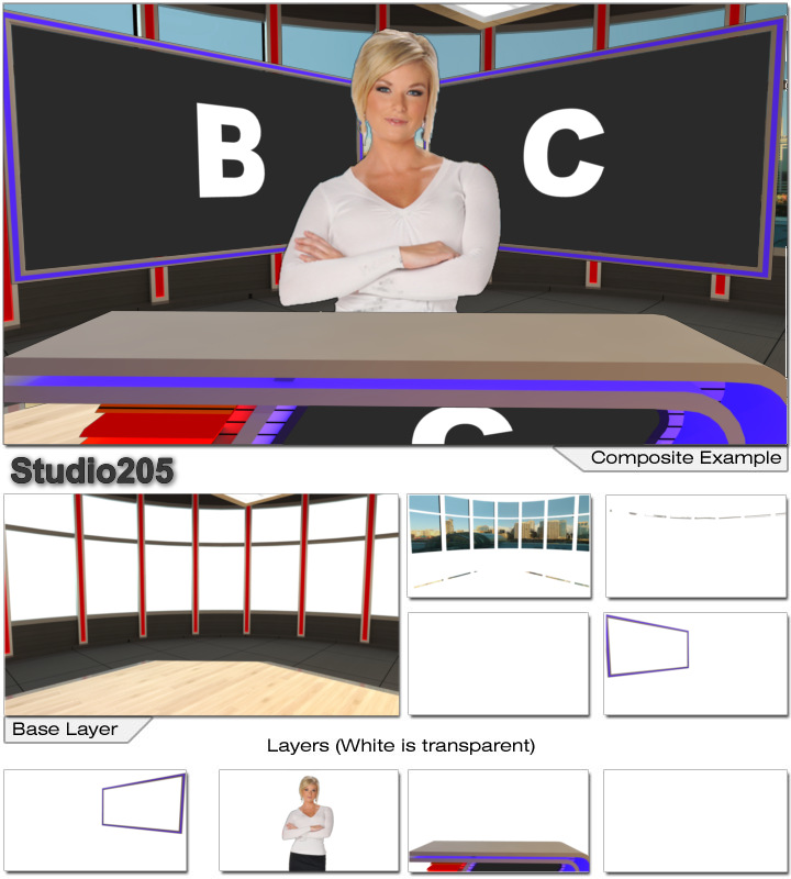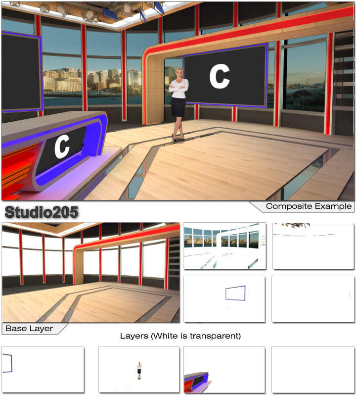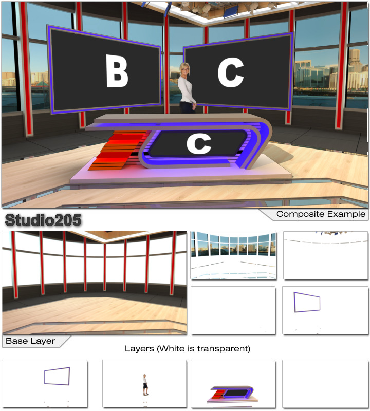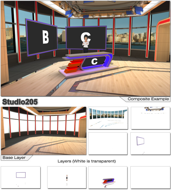 Virtual Set Studio 205 for Virtual Set Editor is a news room with optional screens and desk.
