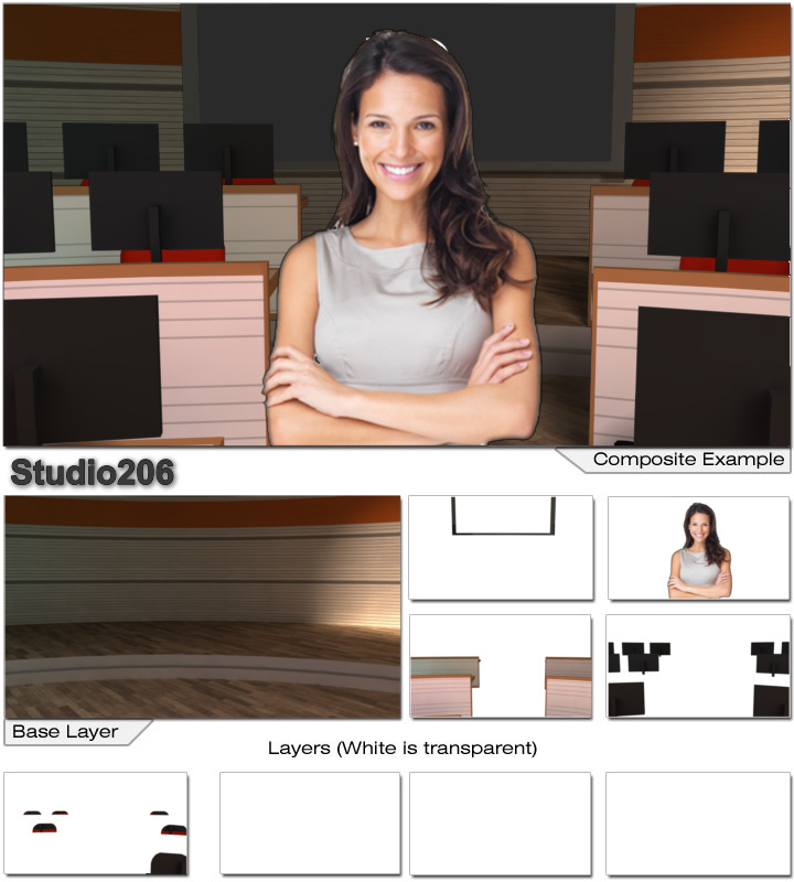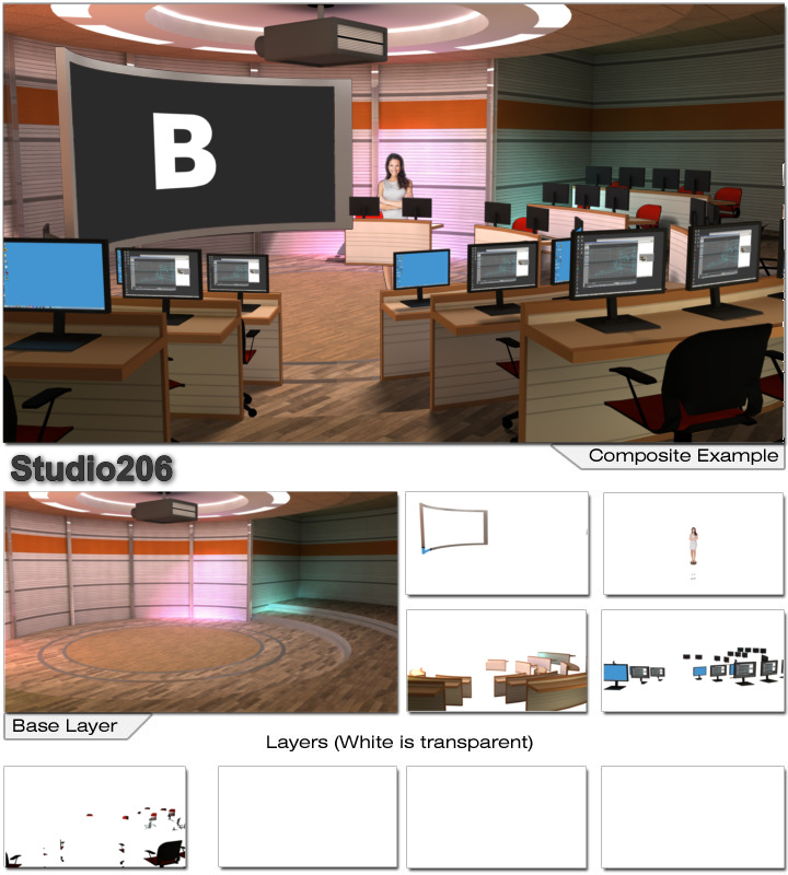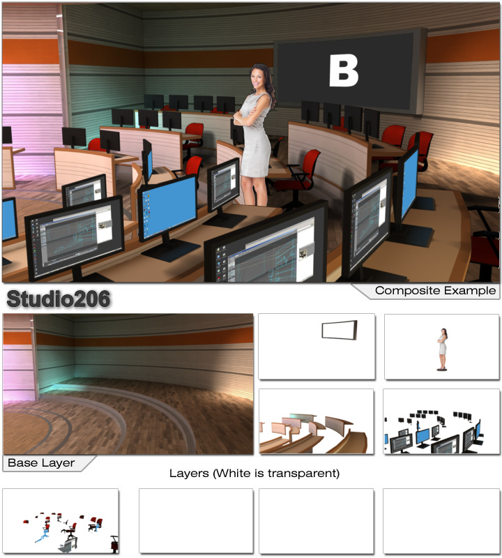 Virtual Set Studio 206 is a lecture hall classroom with projection screen and computer screens.