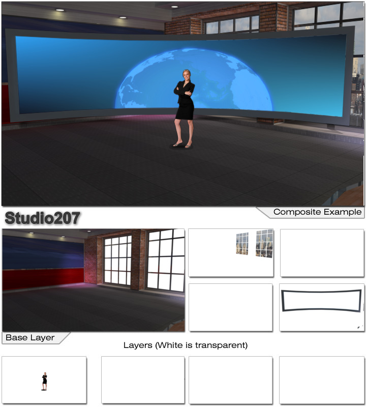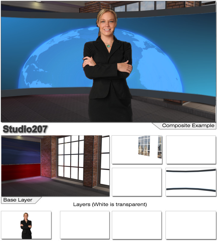 Virtual Set Studio 207 is a large news room with multiple locations and optional screens and desks.