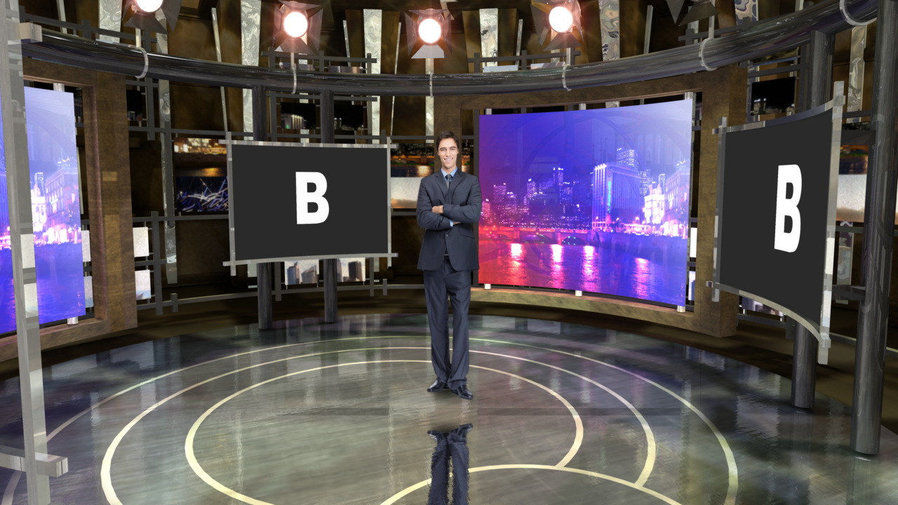 Virtual Set Studio 113 for 4K is a circular room with presentation monitors all around it.