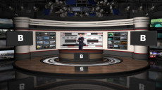 Virtual Set Studio 187 for 4K is a nightly news room with a desk and configurable monitors.