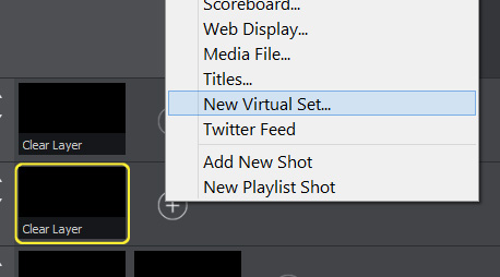 Start Wirecast and add a Virtual Set Shot by clicking + on a layer and selecting New Virtual Set. Pick one of our sets from the list that appears.