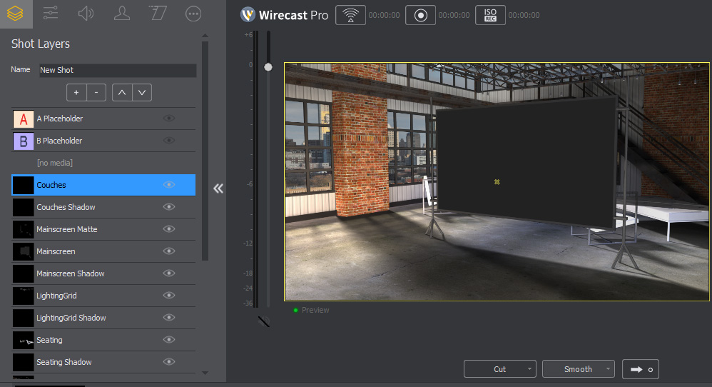 In your Shot Layers you should now have a list of layers and your Virtual Set in the preview window. You can turn off the A and B Placeholder by clicking the eye icon to toggle visibility. You can delete layers entirely by selecting them and clicking the minus (-) button.