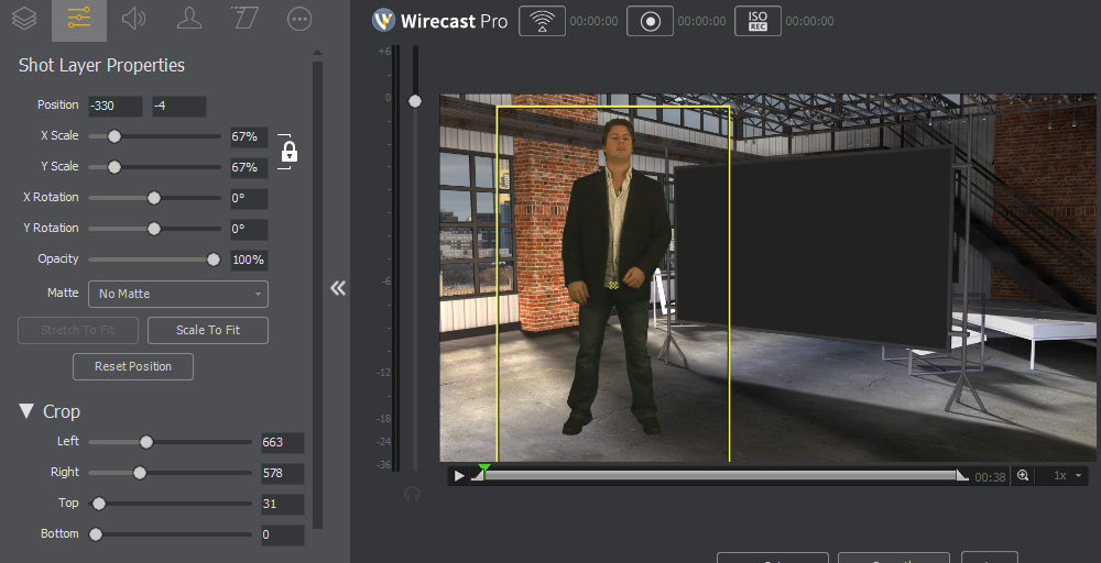 The Cropping controls can be found in the Shot Layer Properties under the Crop controls. Once your shot is clear of greenscreen and extra material you can also use the scale and position settings here to adjust where in the set your talent is placed.
